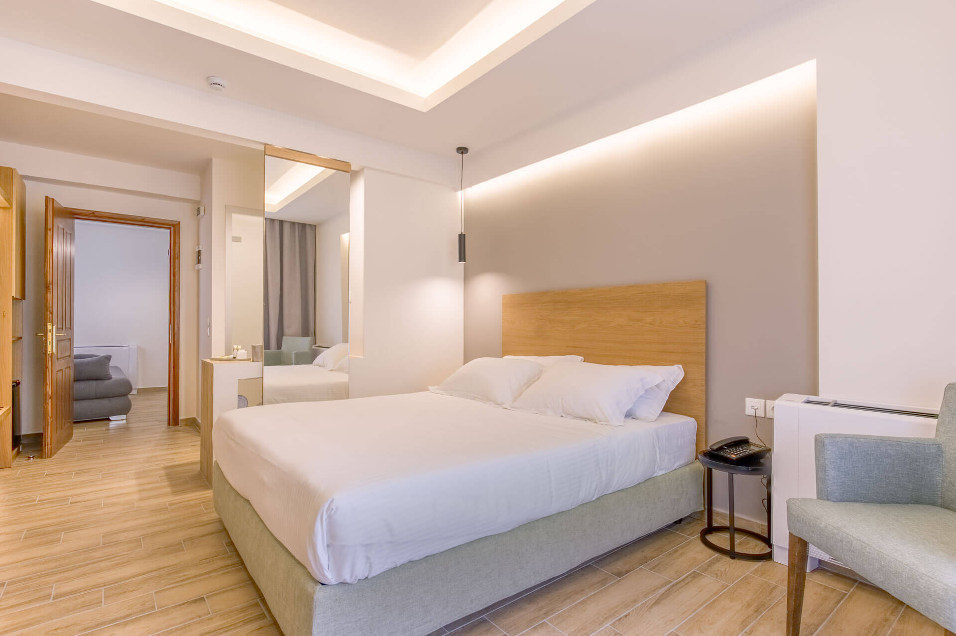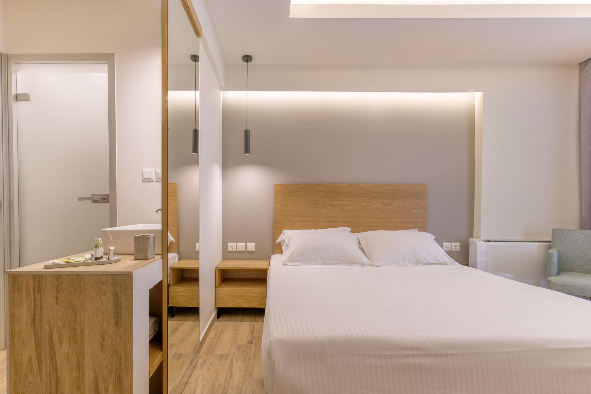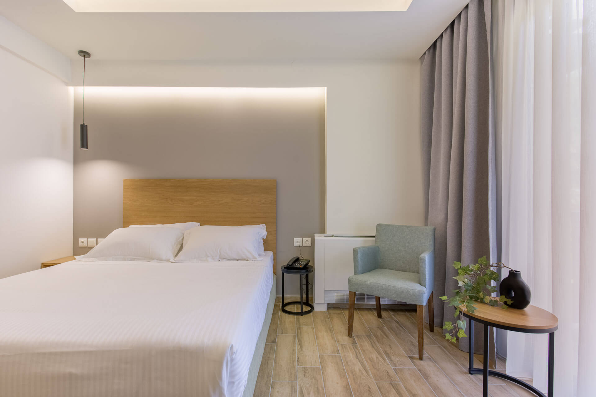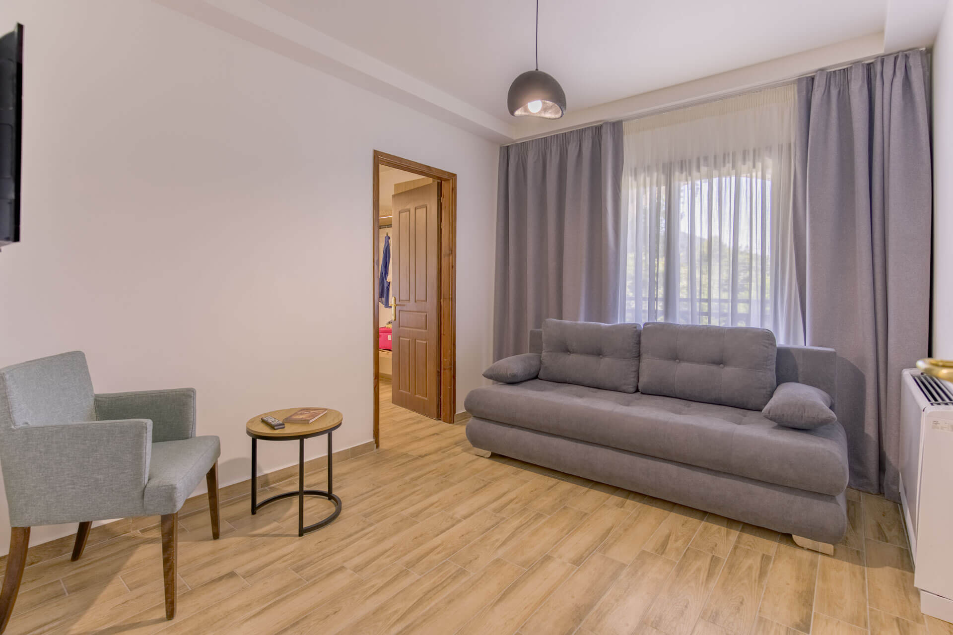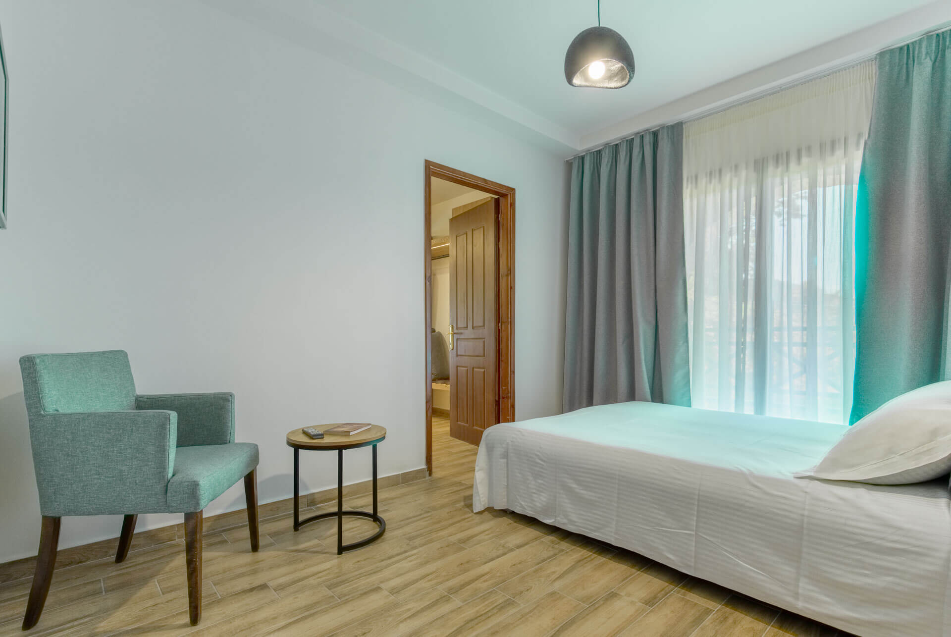 Large triple rooms are located on the first floor and have an awesome Aegean sea view, large windows and a lot of space inside. You are also able to upgrade your room to an upper floor. The rooms on the second floor come with a balcony and 2 comfortable chairs for your disposal.