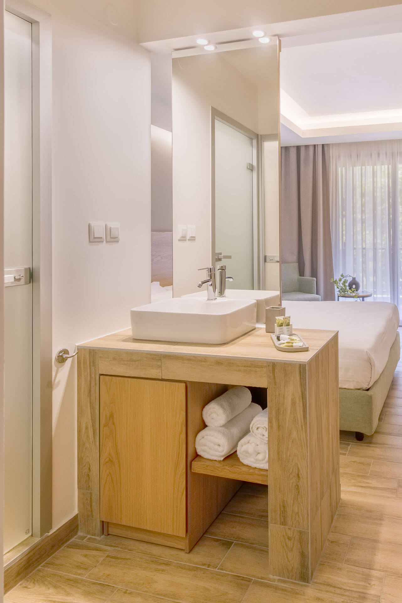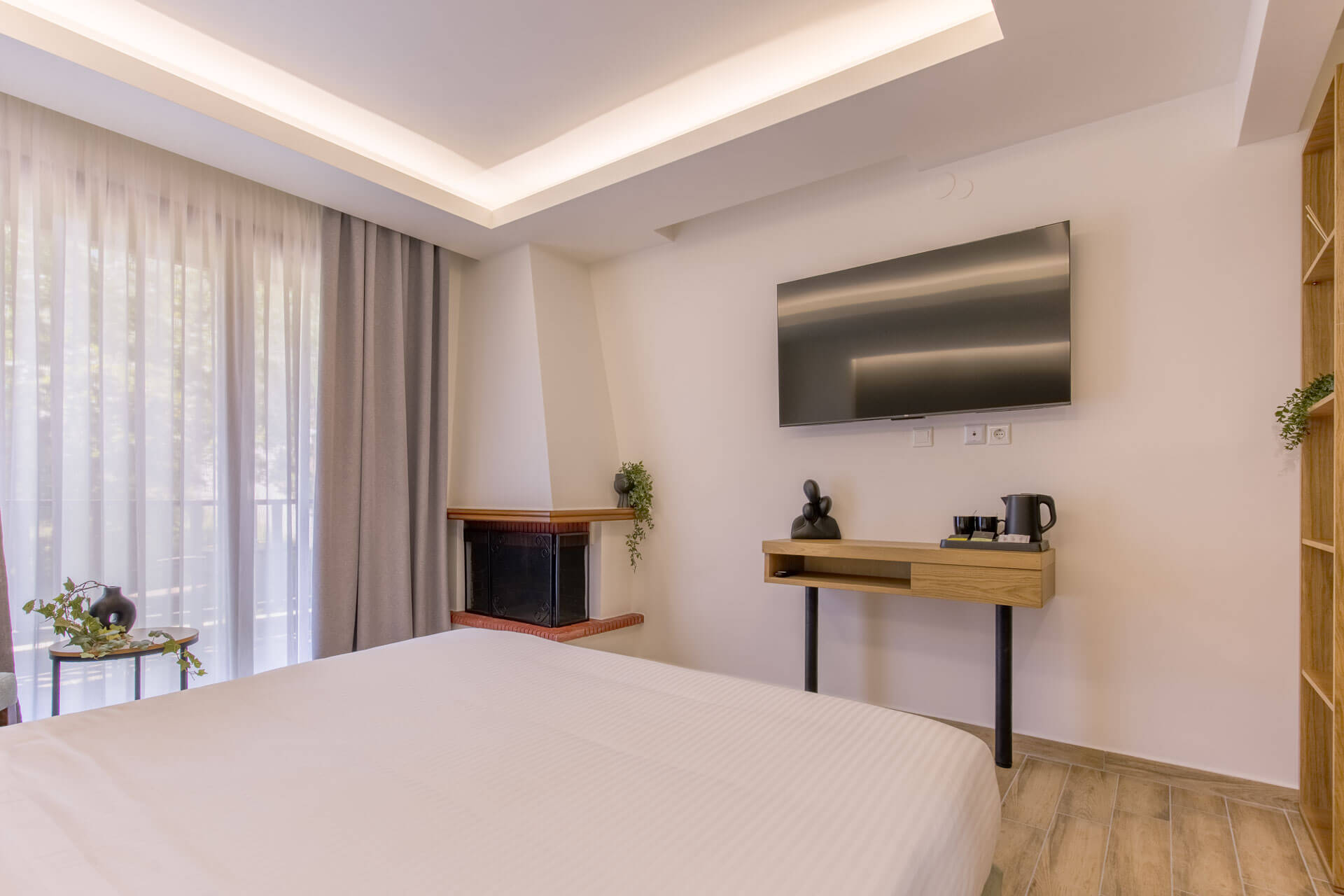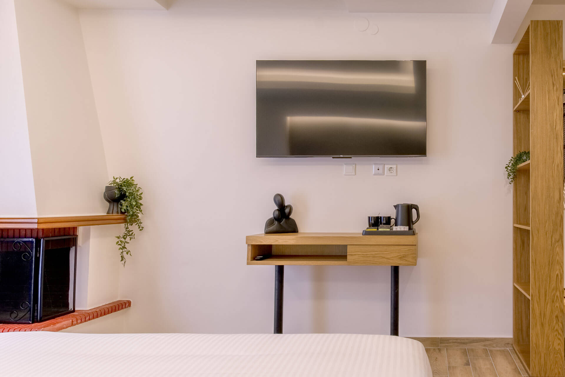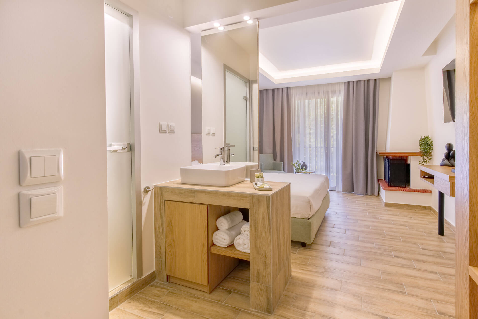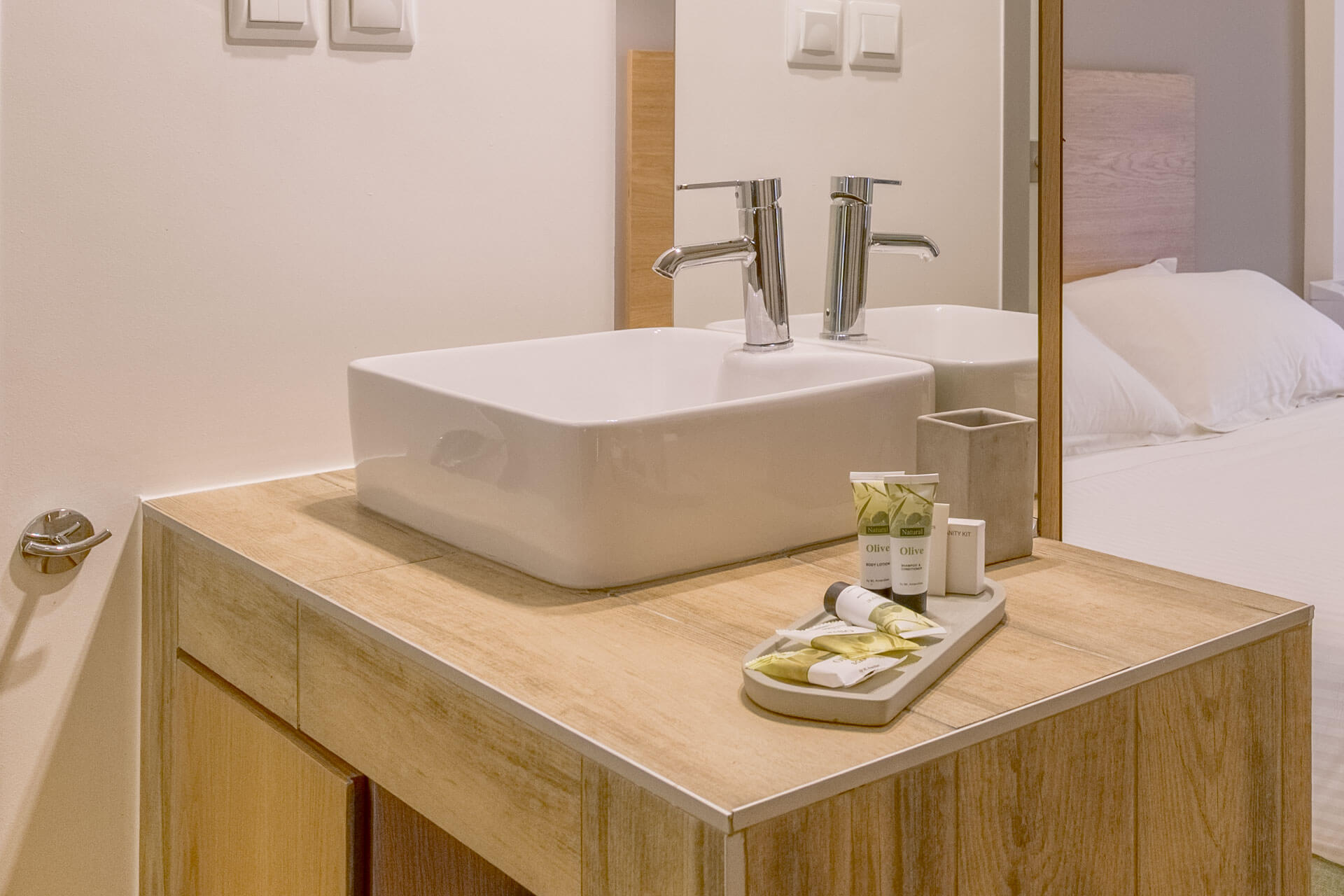 Large triple rooms are located on the first floor and have an awesome Aegean sea view, large windows and a lot of space inside. You are also able to upgrade your room to an upper floor. The rooms on the second floor come with a balcony and 2 comfortable chairs for your disposal.